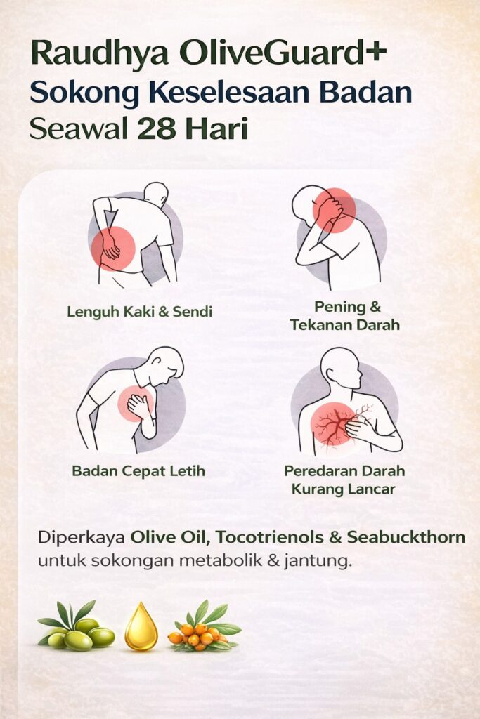Raudhya OliveGuard+ Diperkaya Bahan Aktif Polyphenols, Tocotrienols (Super Vitamin E) & Omega Aktif Menyokong Kawalan Gula, Kolesterol & Tekanan Darah